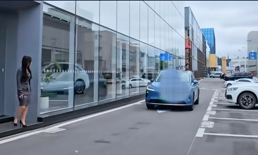 视频中,车辆以十来码的速度快速地缓慢驶来,躲在墙角的身材高挑的女员工,一个闪现来到车前,车瞬间刹停,车身平稳!