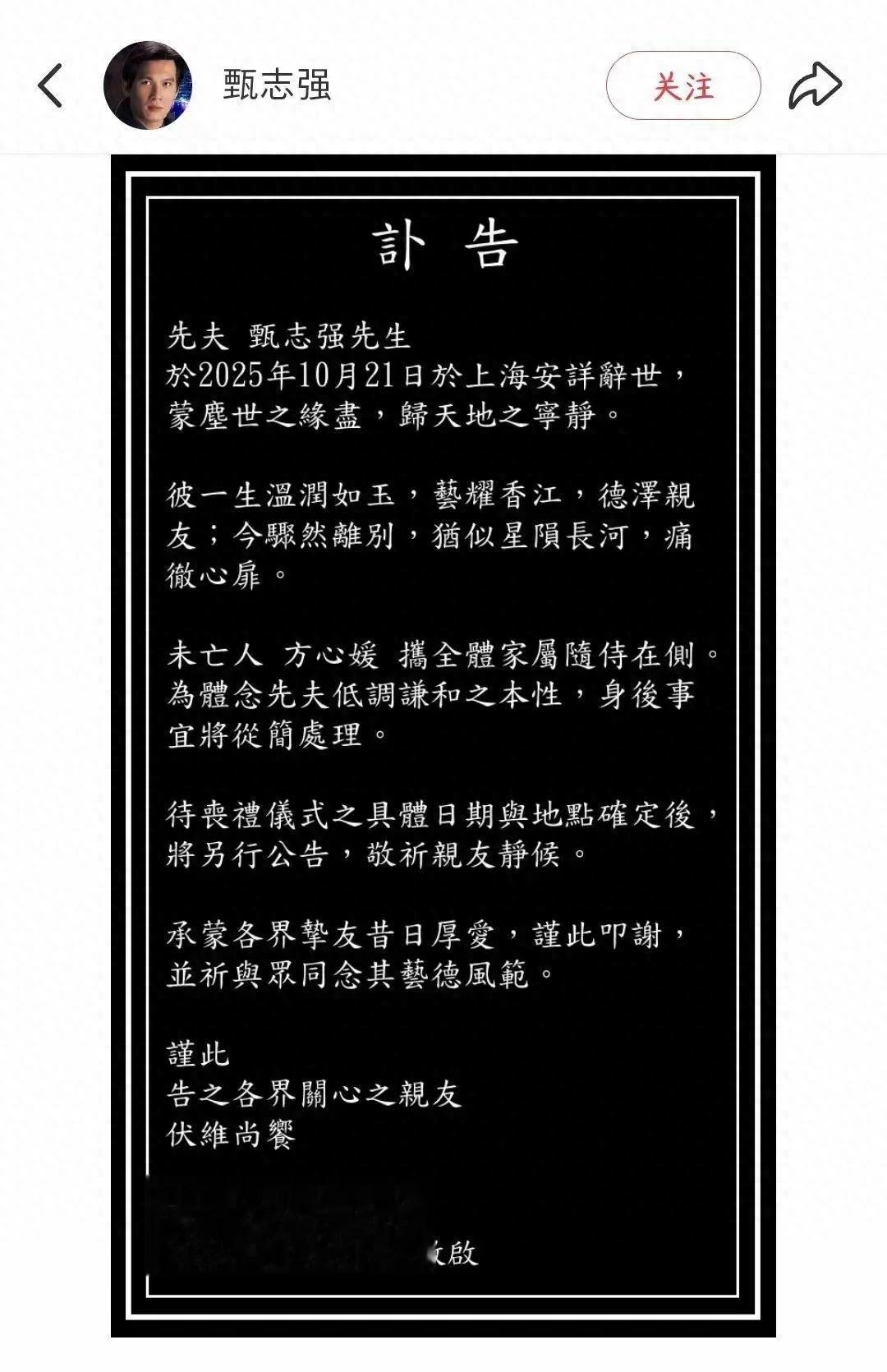 今天,他的妻子方心媛发布了讣告,证实了甄志强先生在上海与世长辞的消息,年仅58岁,真的是太突然了!