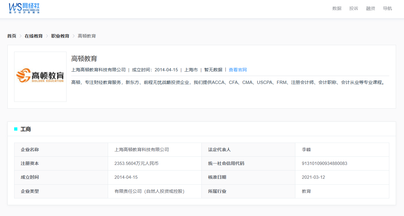 网经社企业库显示,“高顿教育”隶属于上海高顿教育科技有限公司,法定代表人李峰。
