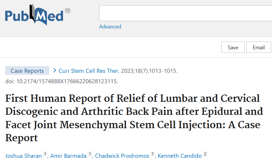 四、临床案例支持2023年,期刊《Current Stem Cell Research & Therapy》发表了一篇题为《First Human Report of Relief of Lumbar and Cervical Discogenic and Arthritic Back Pain after Epidural and Facet Joint Mesenchymal Stem Cell Injection: A Case Report》的研究,为干细胞疗法治疗慢性腰背痛提供了新的临床证据。