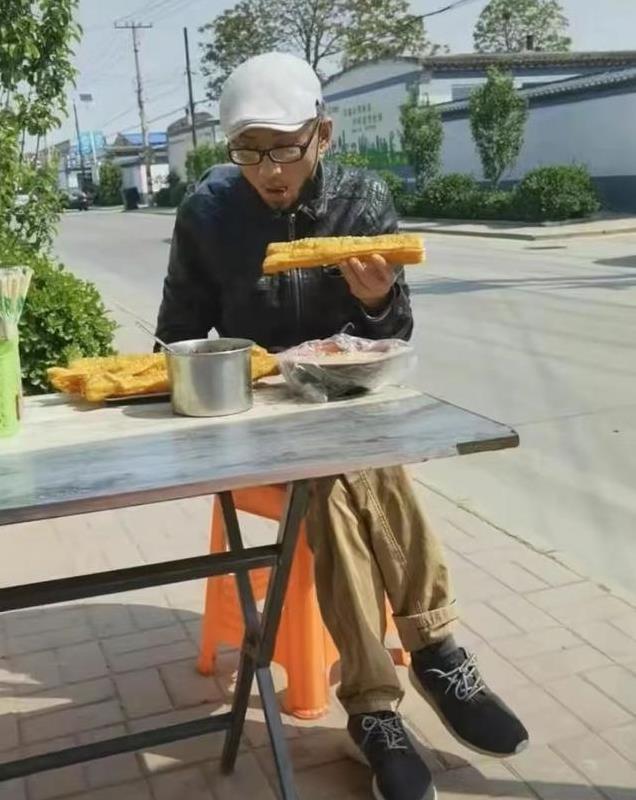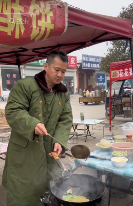 去年,李嘉明更是为了生活所迫,穿着一件破旧的军大衣摆摊卖起了炒面。他的摊位不大,甚至可以说是简陋,几张小桌、几把凳子。周边的环境更是简陋,大概是小县城。