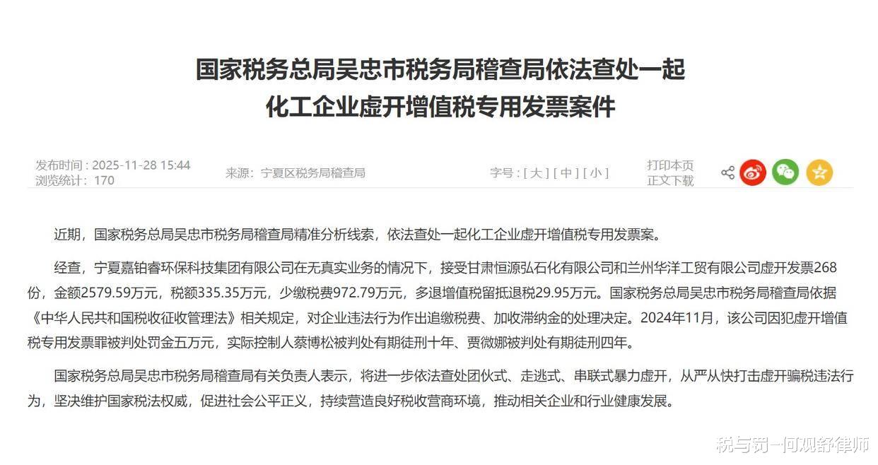 经查,宁夏嘉铂睿环保科技集团有限公司在无真实业务的情况下,接受甘肃恒源弘石化有限公司和兰州华洋工贸有限公司虚开发票268份,金额2579.59万元,税额335.35万元,少缴税费972.79万元,多退增值税留抵退税29.95万元。国家税务总局吴忠市税务局稽查局依据《中华人民共和国税收征收管理法》相关规定,对企业违法行为作出追缴税费、加收滞纳金的处理决定。2024年11月,该公司因犯虚开增值税专用发票罪被判处罚金五万元,实际控制人蔡博松被判处有期徒刑十年、贾微娜被判处有期徒刑四年。