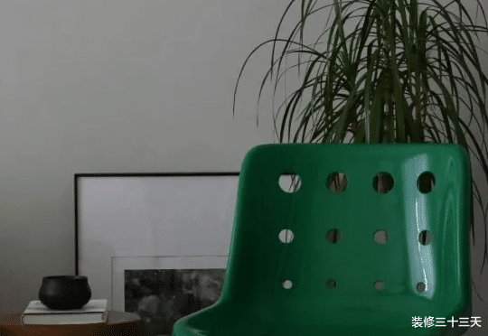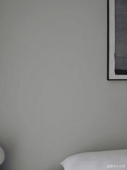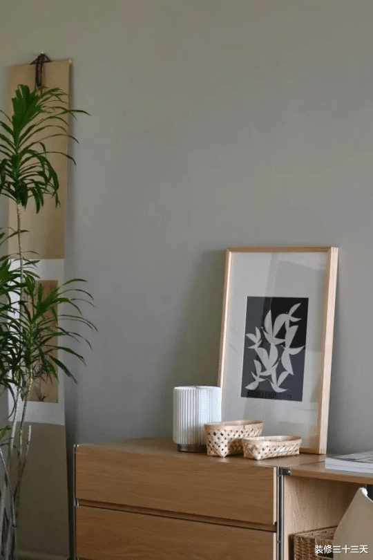 ▲ 客厅的墙面,选用了暖灰偏一点绿的色调,用乳胶漆涂刷。房门、踢脚线也定制了与墙面相近的颜色。空间在简素的色调下,呈现出更加柔和舒适的氛围,木质的地板、剑麻地毯,让空间多了一份自然感