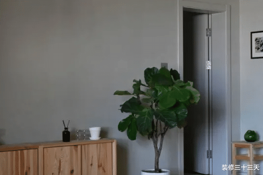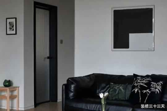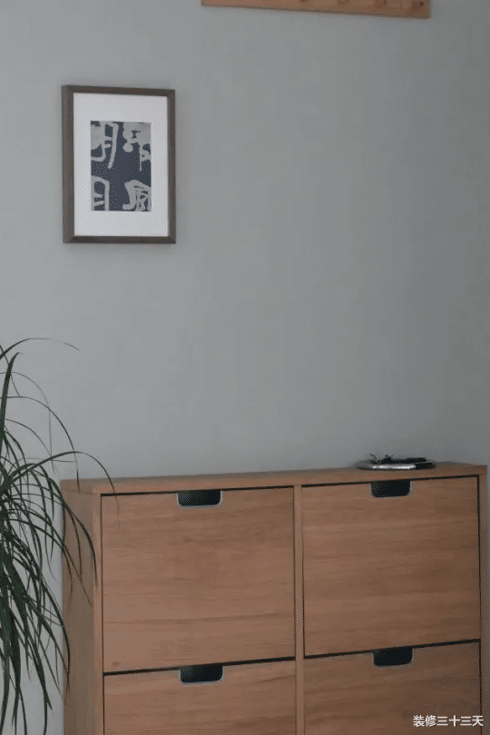 ▲ 防盗门由原先的猪肝红色,粉刷成了黑色,更加契合整个空间。鞋柜的上方,配一小幅中式题字,让入口处多了几分文人气息
