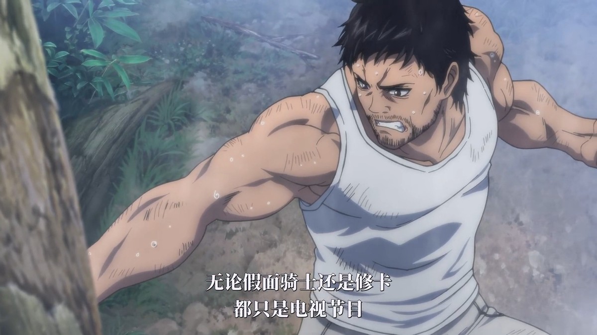 作为动画党的白糖自然是不会特意去补原作的hhh,所以还是聊聊剧情方面吧。如果说《战队红战士转职冒险者》是写给特摄厨的情书,那么《东岛丹三郎》就是写出了特摄厨的心声,首先设定上,男主人公东岛丹三郎是一位酷爱《假面骑士》(尤其是一号)的特摄粉丝,并且将骑士精神作为自己的行动准则,而且还会日复一日的练习假面骑士的一招一式,到了后面甚至能够单挑赢一头成年猛熊,修炼到这种程度就是为了击败修卡,即使他知道这只是电视节目。