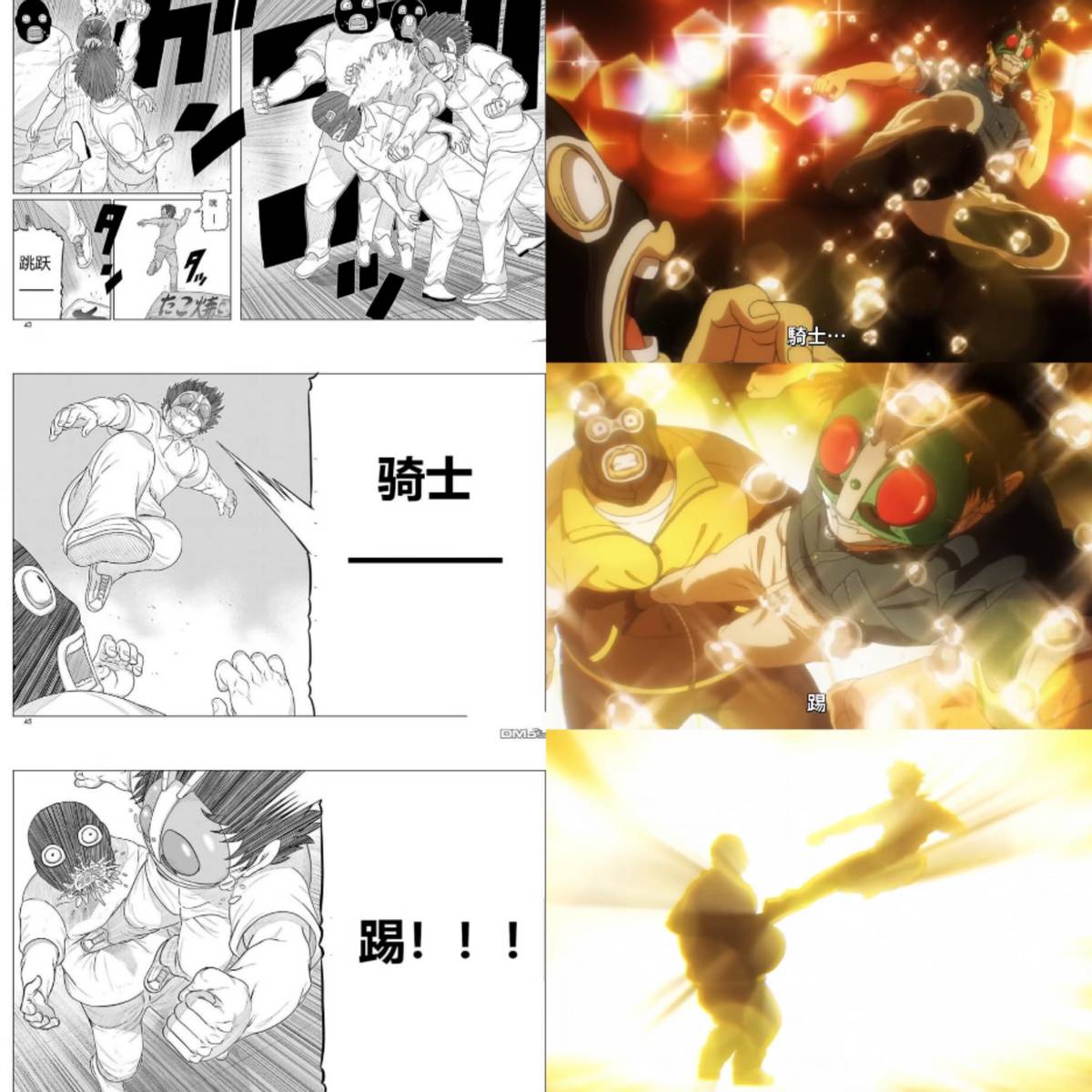 动画对原作中“简陋”的人物进行了美化,演出方面则不仅仅让打斗画面更加富有冲击性,并且在各种分镜上也能体现制作组对特摄的热爱,比如下图中右三的分镜就是制作组单独加上的,在动作上也进行了修改,更贴合假面骑士的动作,在这段打戏中还使用了《假面骑士一号》的OP变奏作为插曲,可以说是细节满满。