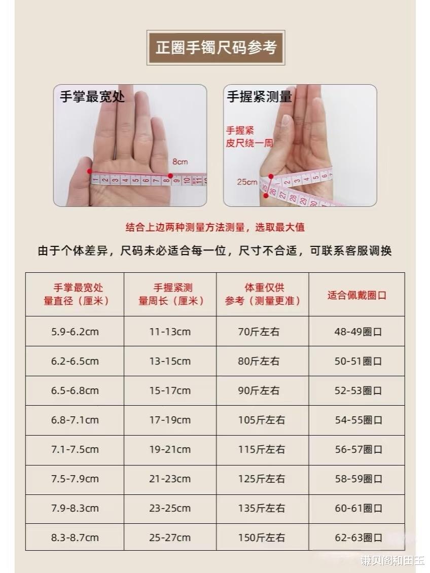 注意:如果是椭圆形(贵妃镯),尺寸要比正常圈口大0.2厘米。