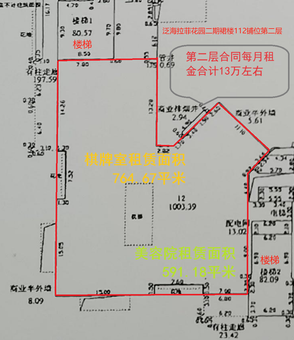 3、租金回报率高,商铺租户稳定,且基本上都是满租状态,目前一楼租给了二房东,二房东分租给各个商户,当前一楼租金每月27万,二楼租给棋牌室和美容院,租金每月13万左右,目前整个商铺月租金40万左右。以上调查反馈水、电为商用,年租金480万元每年。