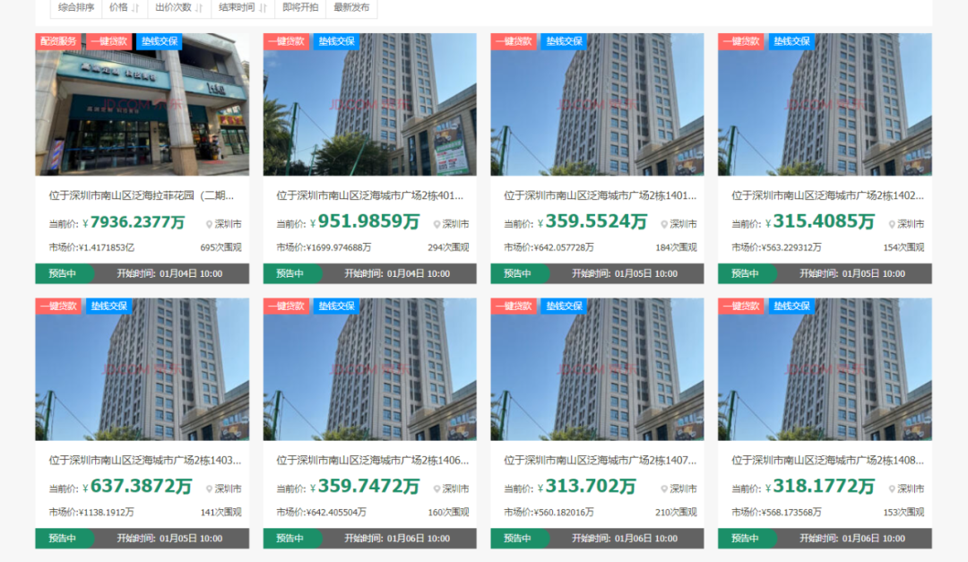 一、深圳市南山区泛海拉菲花园2套不动产(南山区泛海拉菲花园二期1栋裙楼112、南山区泛海拉菲花园二期1栋裙楼207,2023年12月5日一拍价格99202971元因为无人参加报名出价而流拍)二拍挂网拍卖时间2024年1月4日,在一拍价格基础上下浮20%即79362377元起拍。