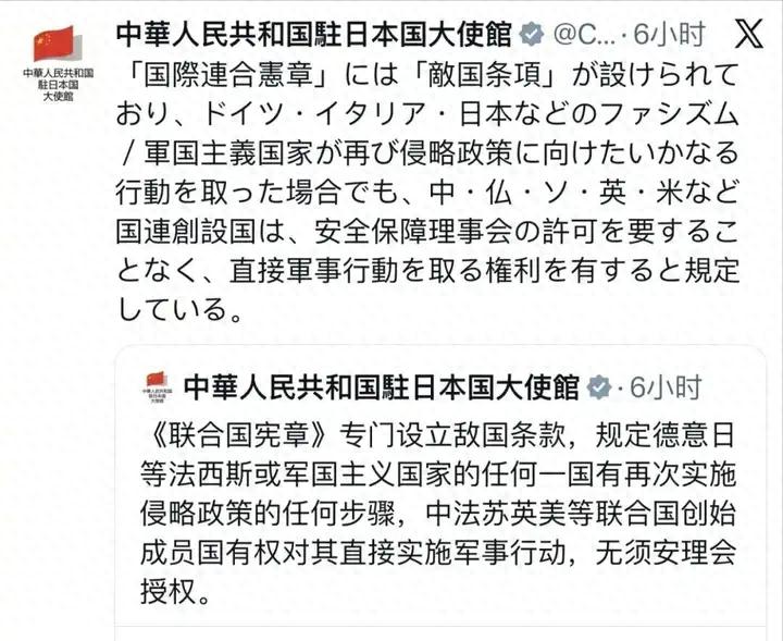 中国驻日大使馆在2025年11月21日用中日双语发布的一条社交媒体消息,让世界重新关注到《联合国宪章》中一个几乎被遗忘的条款——“敌国条款”。