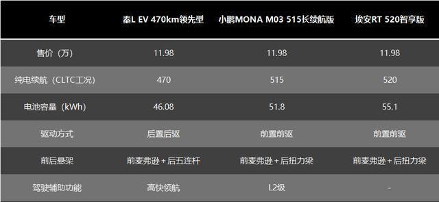 说到能跑多远和动力咋样,埃安RT最牛,它那块55.1度的电池能跑CLTC标准的520公里。讲到力气大,也是埃安RT领头。不过话说回来,小鹏MONA M03和埃安RT都是前面轮子驱动的,而且后面都用了扭力梁悬架。这样一来,开起来的感觉就比秦L EV差了不少。