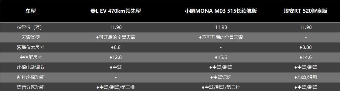 从咱们平时用车的需求来说,埃安RT的基础款那配置可是挺全的。不光主驾驶和副驾驶位置能电动调,就连前排的座椅都能通风加热。反观秦L EV的基础款和小鹏MONA M03的最低配,它们两者的配置那就差不多,没啥太大差别。