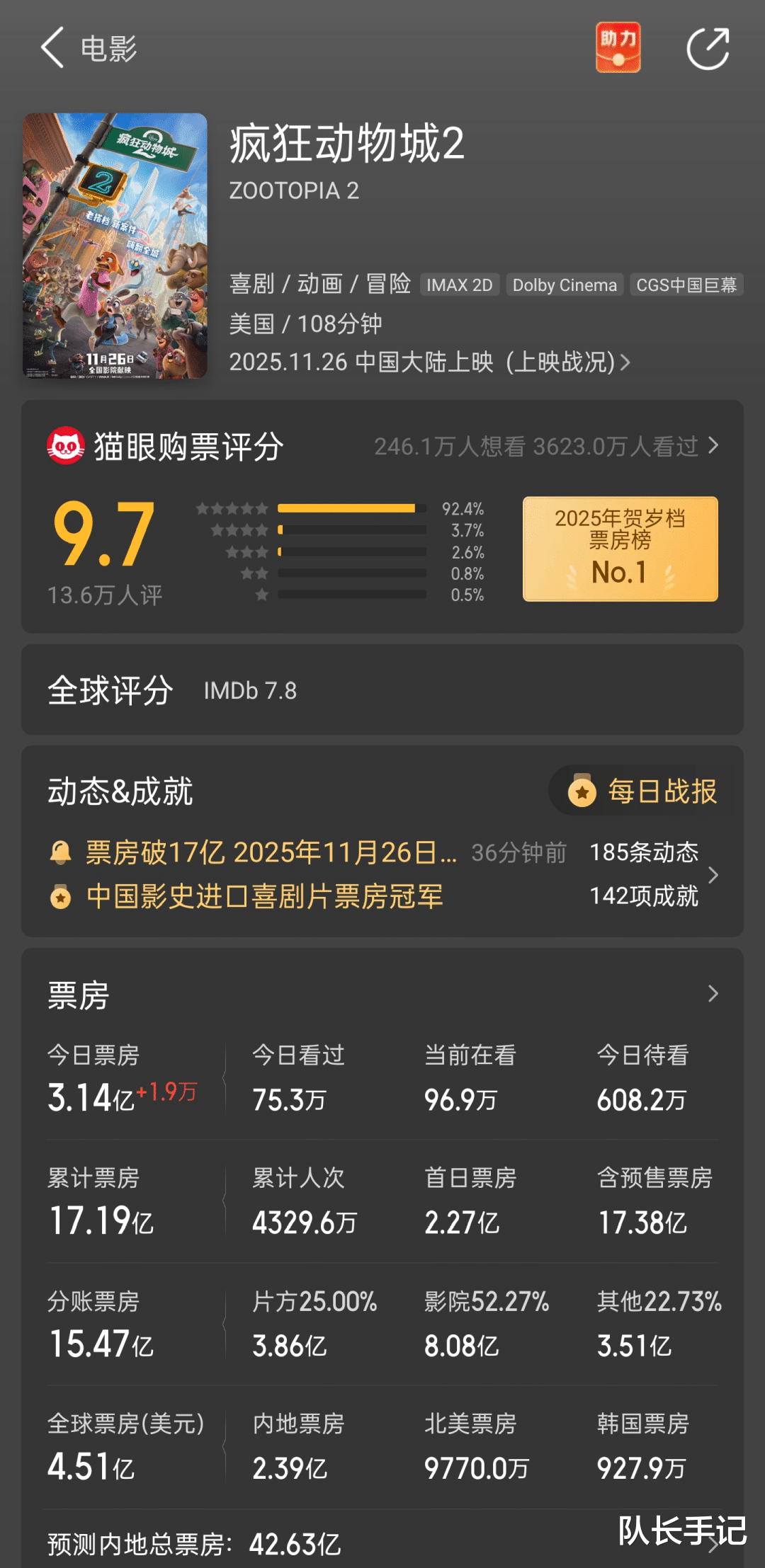 有些机构已经开始预测,《疯狂动物城2》的累计票房基本提前锁定30亿以上了,最高可能突破50亿。它上映的档期并不是大热的春节档,就是一个普通的淡季,票价也不是很贵。从观影人次来看,它已经超过了《哪吒2》的单日观影人次。《哪吒2》单日观影人次的峰值,是1700万,而《疯狂动物城2》在本周六,观影人次突破了1800万。为什么这么多人去看《疯狂动物城2》呢?