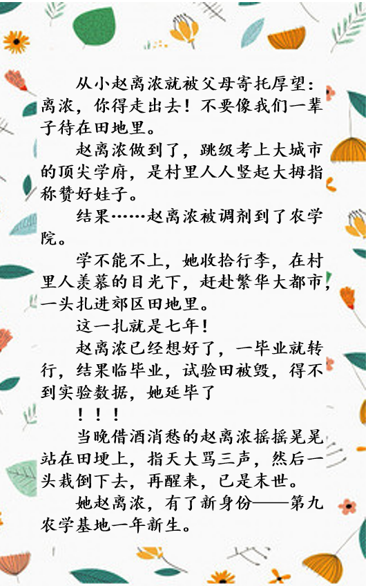 农学生赵离浓以为自己穿越到另一个人身上,这个人也是农学生,只不过在这个世界植物会异变杀人,导致整个农业水平瞬间倒退,有关农业种植知识被研究员们牢牢把握,而普通人没有资源,不断在死亡边缘沉沦,直到女主的到来打破了这种困境……
