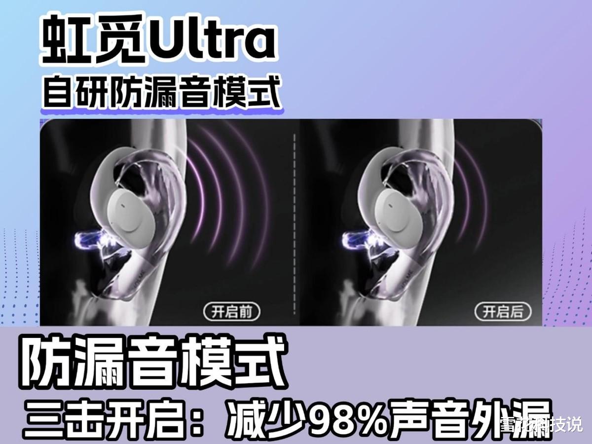 虹觅 Ultra搭载的16.2mm超大尺寸石墨烯振膜让声音更细节,保留了原始的声音,搭配了H-zone全景空间音效用来优化音质的同时还能提高音乐的氛围感,三击耳机能瞬间切换防漏音模式,避免路人听见耳机声音的尴尬情况,把开放式耳机的缺点很好的解决了,触片充电方式优化了传统触点式充电容易接触不良的痛点,充电效率更高更稳定,智能一拖二能让你做到双设备无缝切换,这样的配置只有百元的价格,性价比非常的高。耳机拥有8+32小时综合续航和四麦ENC降噪功能,优化了通话收不到声音的问题,搭配的IPX6防水层在做运动暴汗时都能稳定输出。搭载的蓝牙5.4版本芯片还能提高综合性能,让耳机的整体表现提升了一个等级。耳机8g单耳重量佩戴起来更轻量化,人耳流线型设计的设计,使佩戴起来更贴合舒适,并且液态硅胶材质在佩戴起来更轻柔肌肤,久戴也很舒适。