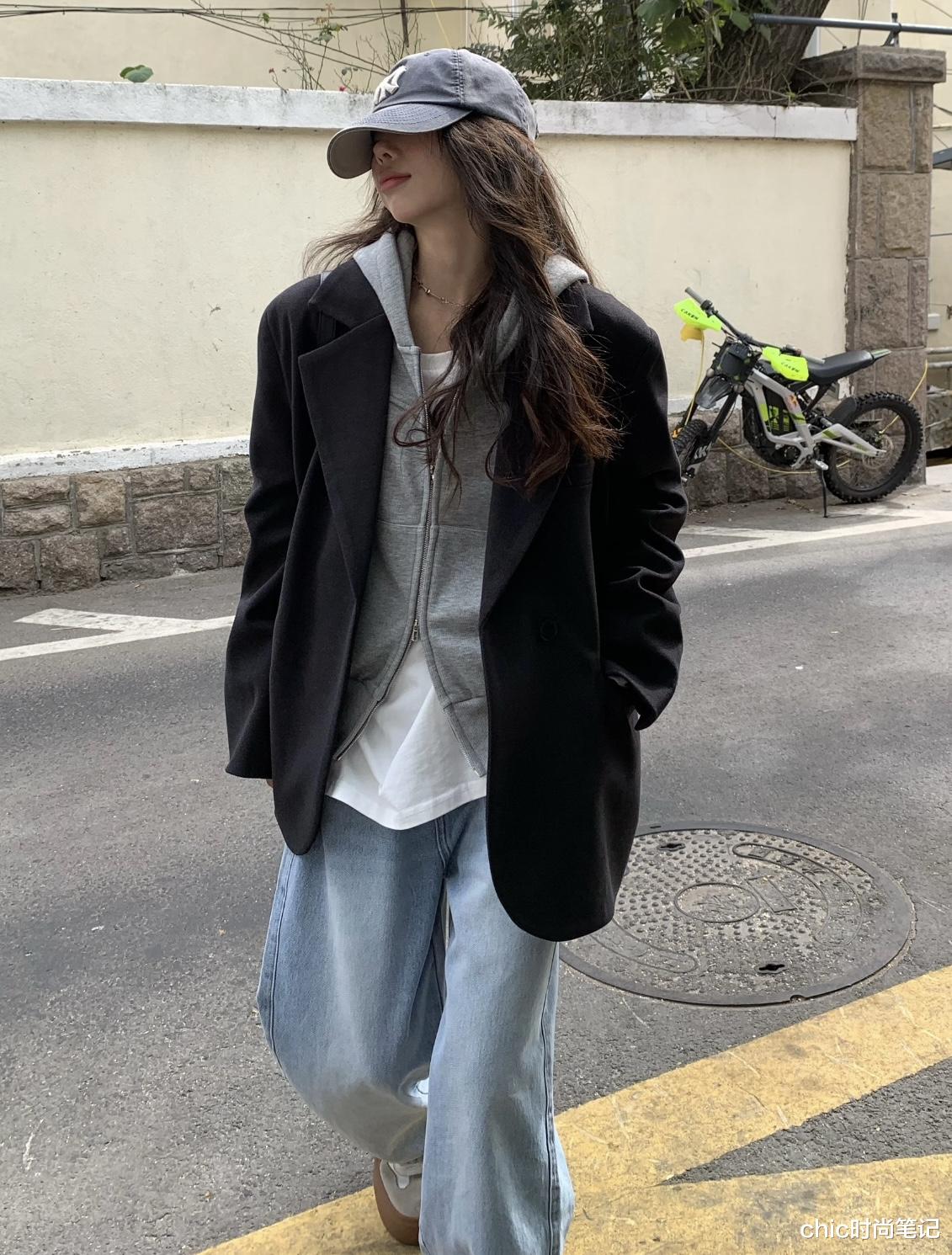 必不可少的西服穿搭示范来了。宽松版型西服搭配T恤+连帽卫衣开衫,上身的层次感较多,所以下半身选择浅色的牛仔裤即可,凸出穿搭重点,休闲满满!