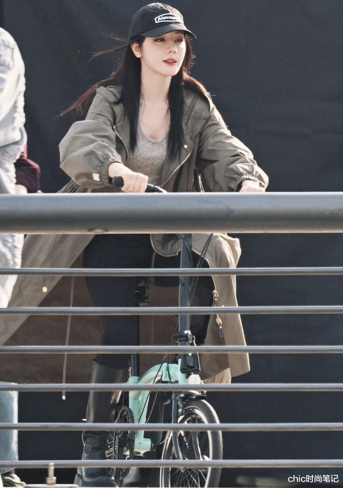 简约的灰色T恤外搭一件军绿色长款风衣,又飒又随性的感觉,搭配紧身裤和高筒靴,看似基础的穿搭穿在女主身上一下子变得不基础了!果然脸在江山在!
