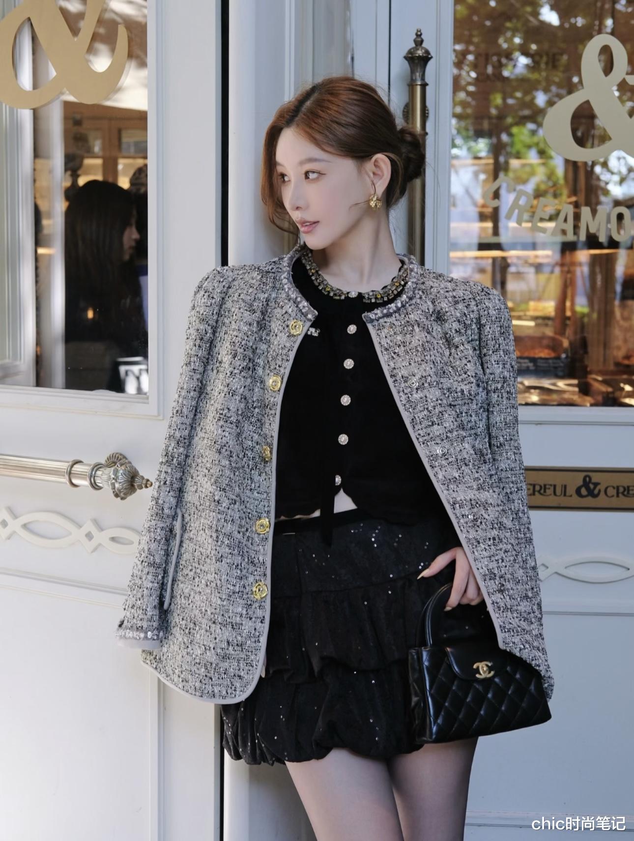 小香风是近年来一直流行的风格,一般是名媛淑女、优雅贵妇等比较经典的造型,偏精致风,一般是粗花呢面料搭配金色或者银色复古纽扣,内搭裙装和精美小香包,时尚名媛get!