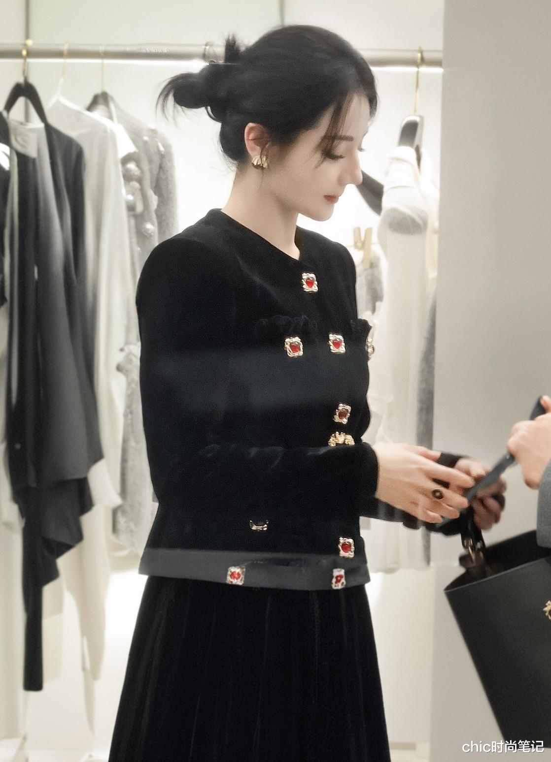一身优雅的黑色小香风裙装亮相,经典的红宝石元素作为纽扣装饰,极具奢华与高级,搭配低丸子头发型,尽显从容与气质。