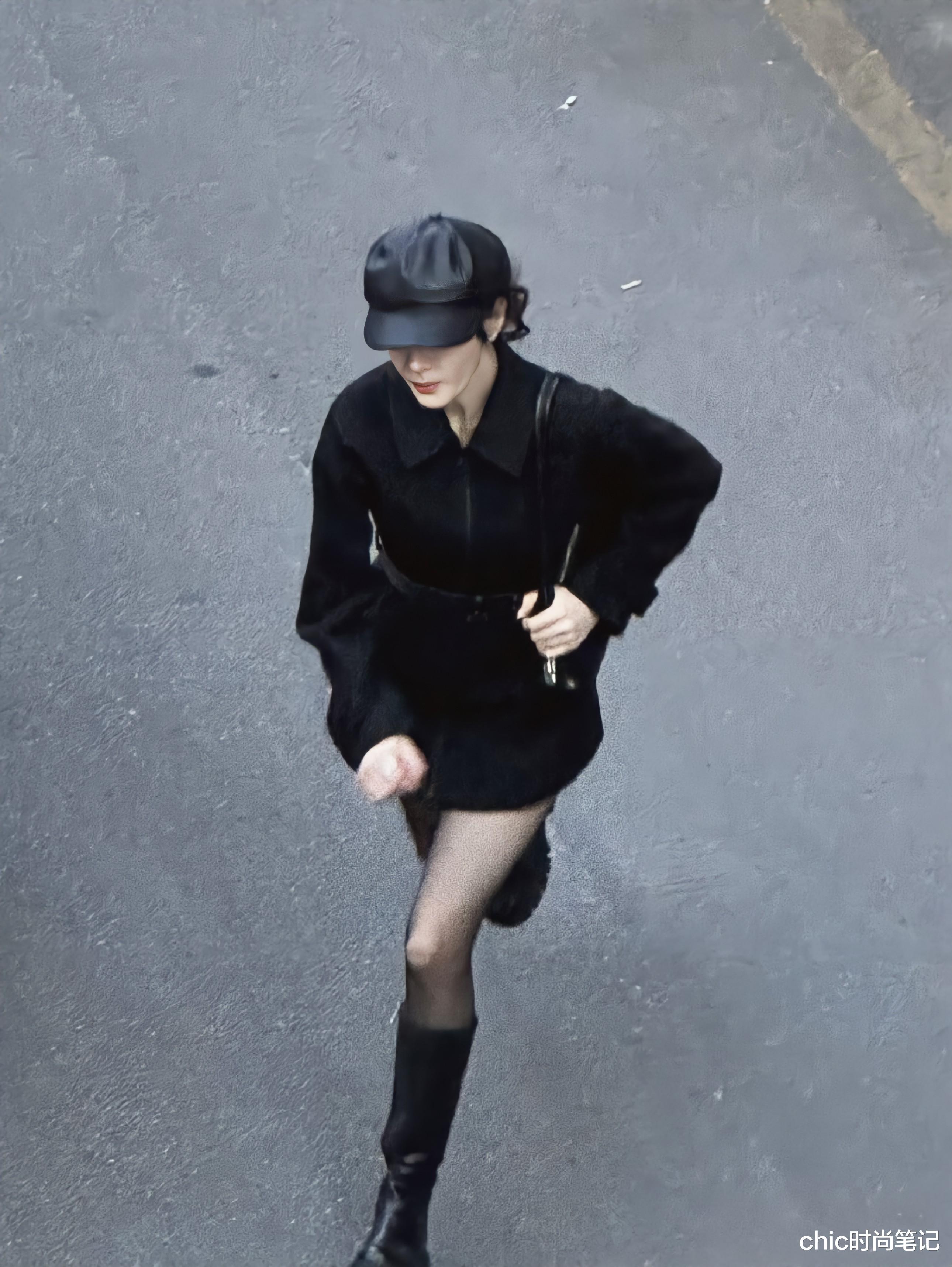 all black穿搭让原本浓颜系长相的女主卫蓝五官更加深邃、立体。黑色长款西服做了收腰设计,搭配黑色贝雷帽和黑色长筒靴,修身剪裁完美勾勒出优越的身材曲线。