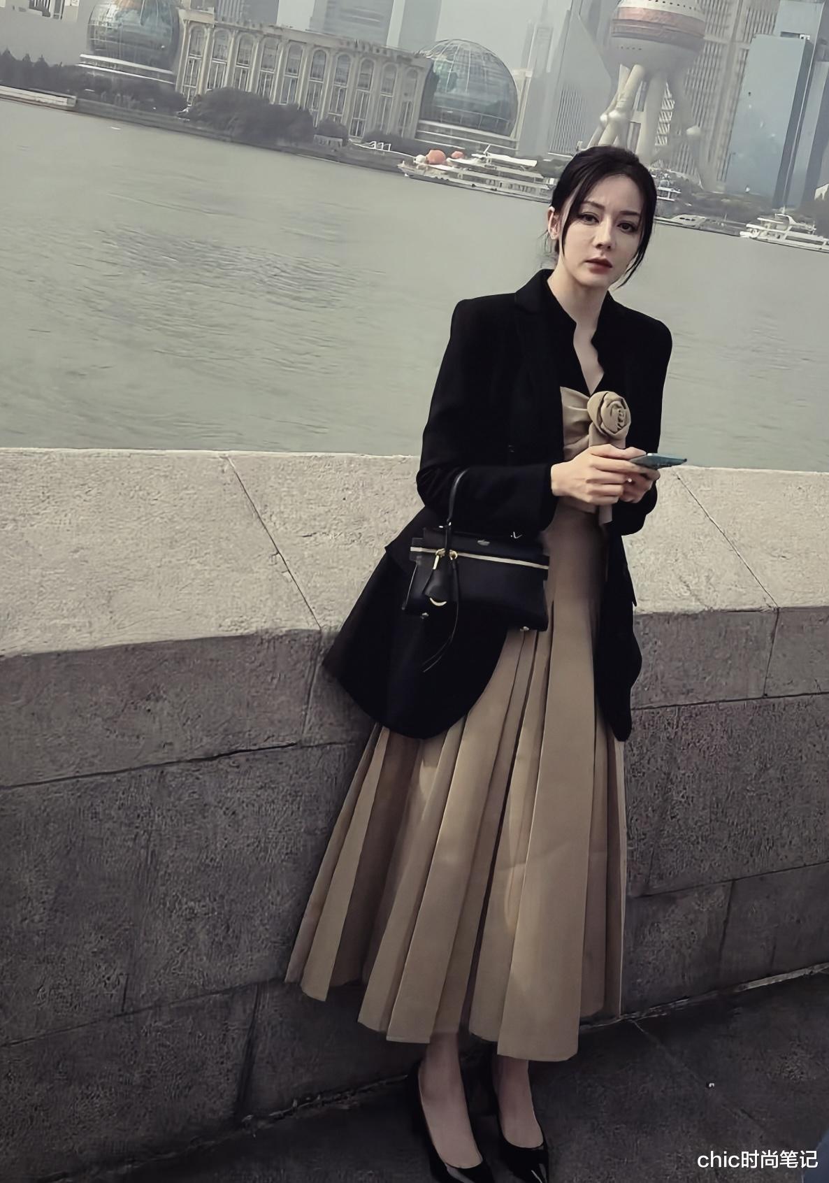 黑色西服是最容易搭配的单品,卫蓝内搭一条卡其色百褶连衣长裙,裙身的玫瑰花设计立体环绕,让原本就精致的造型更加细节,配上黑色尖头高跟鞋,御姐范儿get!