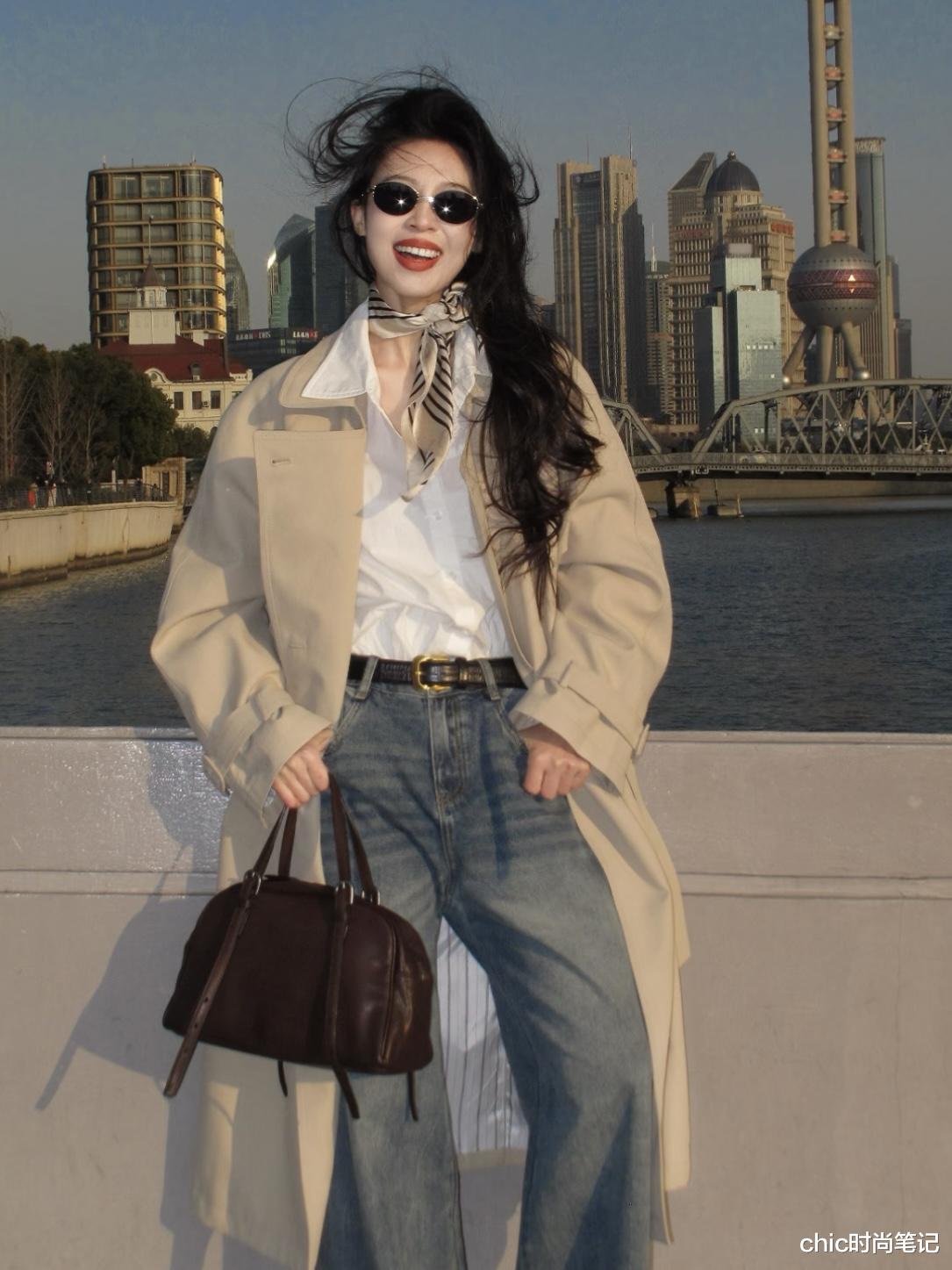 风衣可以驾驭任何一种颜色!卡其色长款风衣搭配简约白衬衫和做旧牛仔裤,选择一条棕咖色条纹丝巾作为配饰点缀,直接点燃穿搭的“灵魂”,复古摩登的法式极简主义完美驾驭。