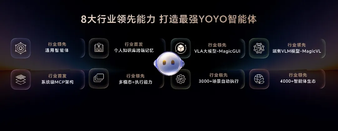荣耀魔法大模型3.0,具有端云结合的大模型矩阵,在多模态理解、任务规划和工具调用等核心能力上,持续进化,紧密协同,达到比肩SOTA的业界顶尖水平。基于荣耀魔法大模型3.0的YOYO智能体,获得中国信通院L3级卓越型权威认证,代表了当前智能体泛化能力的最高水平。