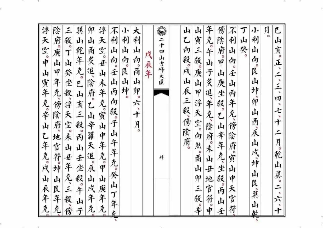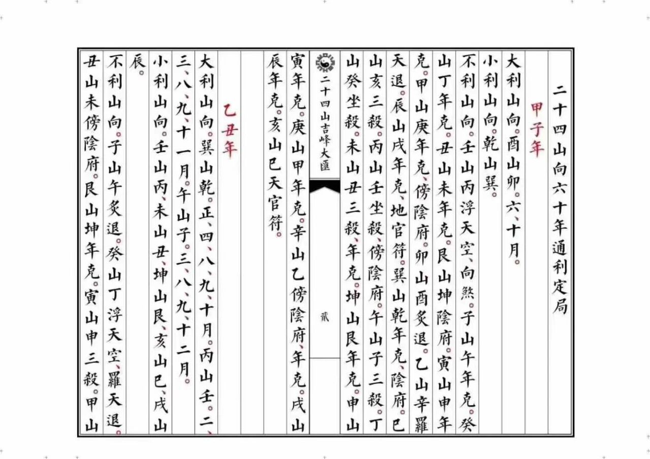 时间维度:书中 “六十年通利定局” 详尽标注每一个干支年份的吉凶方位。例如,甲子年酉山卯向大吉大利,而壬山丙向则需格外规避,字字珠玑,暗藏天机。