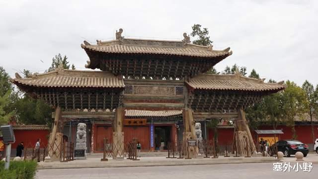 海藏寺入口处一座双层飞檐庑殿顶牌楼,精美的纯木制榫卯结构,正脊装饰吻兽,牌匾书写“海藏禅林”,后方为寺庙山门。