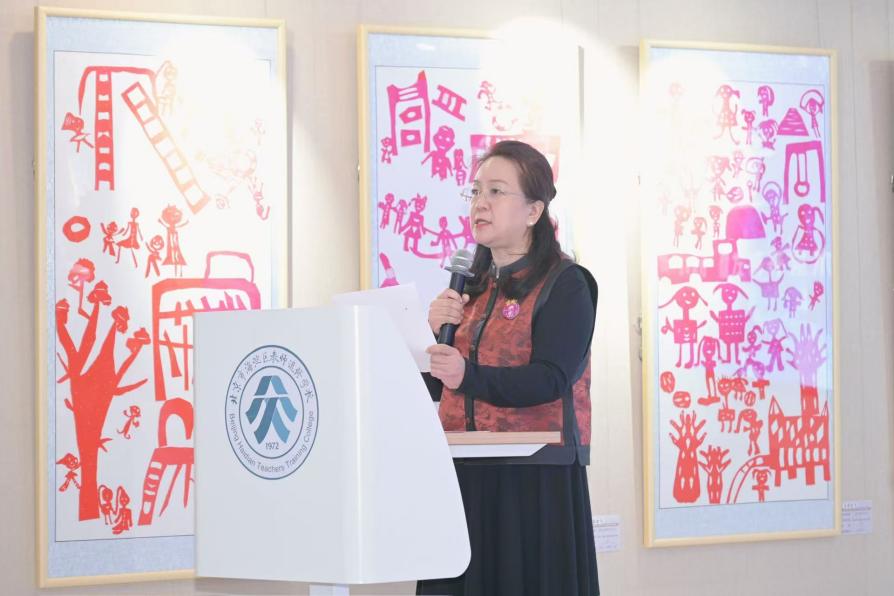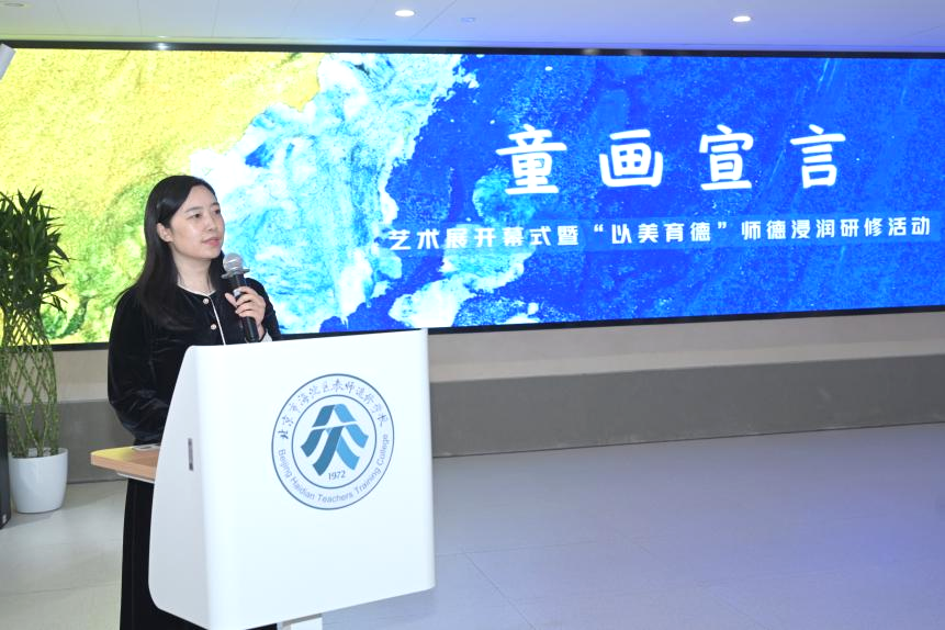 北京市海淀区教师进修学校副校长陈俊荣在致辞中,从区域教研与教师发展的角度高度评价了本次活动。她指出,本次活动实现了两大关键突破:一是打破学段壁垒,实现美育贯通,让中小学与幼儿园教师共同感受艺术启蒙的力量;二是创新师德研修,践行“以美育德”,将画展转化为师德研修的生动现场,引导教师在美的浸润中理解儿童权利、升华教育情怀。