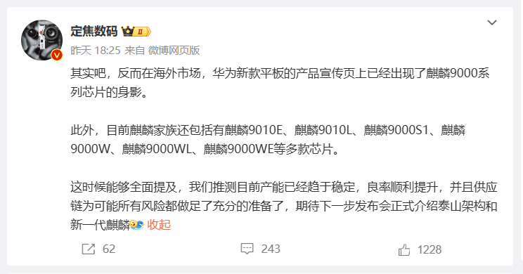 “其实吧,反而在海外市场,华为新款平板的产品宣传页上已经出现了麒麟9000系列芯片的身影。此外,目前麒麟家族还包括有麒麟9010E、麒麟9010L、麒麟9000S1、麒麟9000W、麒麟9000WL、麒麟9000WE等多款芯片。这时候能够全面提及,我们推测目前产能已经趋于稳定,良率顺利提升,并且供应链为可能所有风险都做足了充分的准备了,期待下一步发布会正式介绍泰山架构和新一代麒麟"