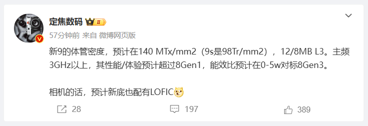 博主定焦数码带来新麒麟芯片消息,他通过微博表示:“新9的体管密度,预计在140 MTx/mm2(9s是98Tr/mm2),12/8MB L3。主频3GHz以上,其性能/体验预计超过8Gen1,能效比预计在0-5w对标8Gen3。相机的话,预计新底也配有LOFIC”