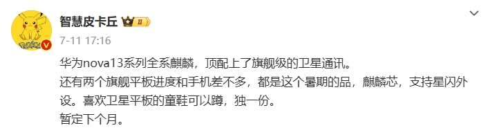 “华为nova13系列全系麒麟,顶配上了旗舰级的卫星通讯。还有两个旗舰平板进度和手机差不多,都是这个暑期的品,麒麟芯,支持星闪外设。喜欢卫星平板的童鞋可以蹲,独一份。暂定下个月。”