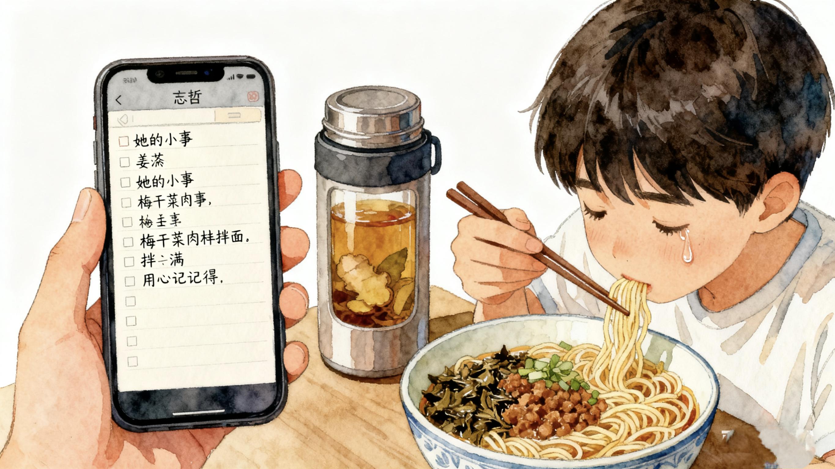 某天下雨,我给她送了一碗梅干菜肉末拌面,还带了保温杯装的姜茶。