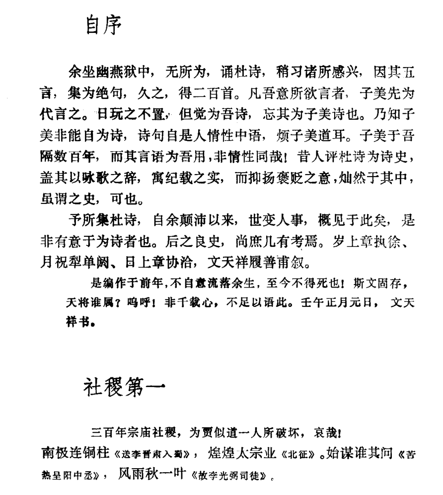 诗作记录宋亡前后的历史事件、个人境遇,每首标明杜诗出处,多数配有题序补充历史背景。如《社稷第一》: