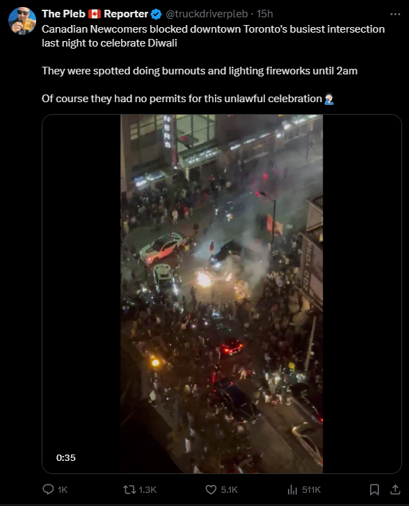 近日,多伦多市中心Yonge/Dundas繁忙十字路口发生的一幕引发了广泛关注和热议。据网友@truckdriverpleb在社交媒体上发布的视频显示,大量人群为庆祝印度排灯节,封锁了该路口,并在未经许可的情况下燃放烟花直至凌晨2点。