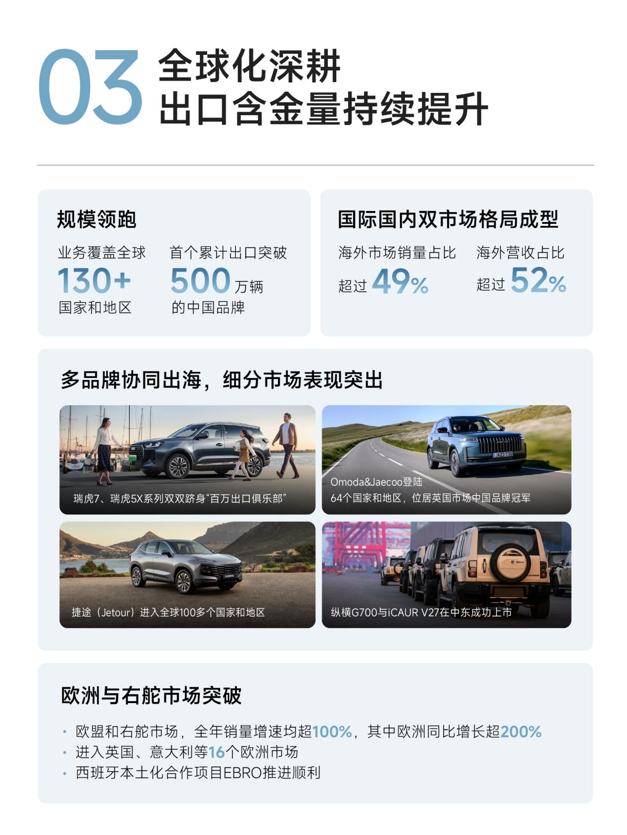 海外营收过半的“结构质变”当海外营收占比达到52.4%,奇瑞的业务结构发生了根本性质变。这意味着企业增长的主要动力,已经从单一依赖国内市场,转变为“国内国际双轮驱动”。发达国家市场更高的单车利润,为34.6%的利润增长注入了高质量动能;多元化的区域布局,让企业在面对单一市场波动时拥有了更强的抗风险能力。这种结构质变,是奇瑞多年深耕海外市场的必然结果,也是其从中国品牌走向全球品牌的关键一跃。