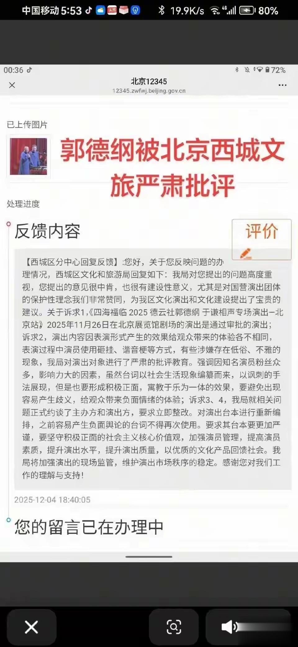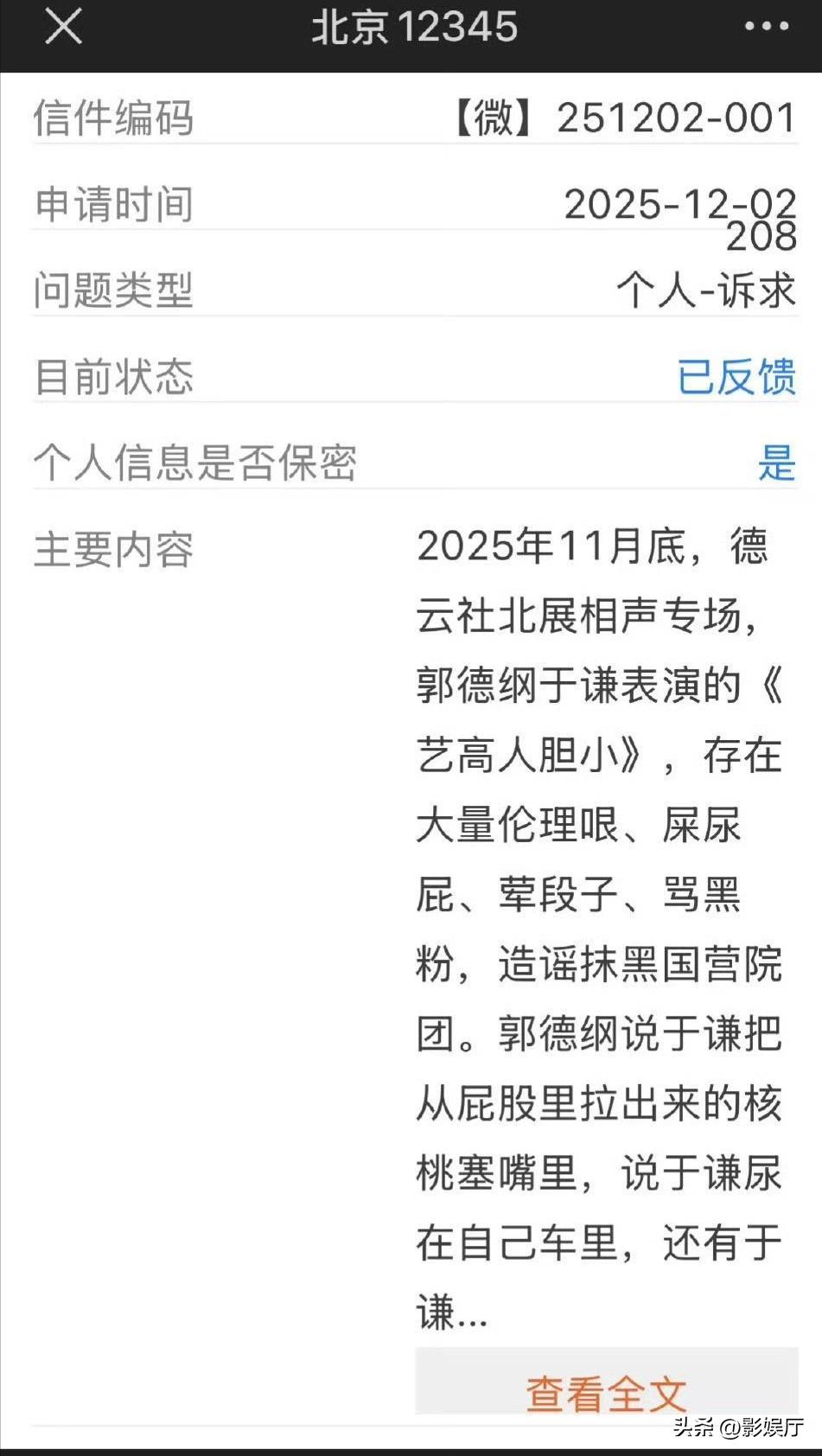 当晚,郭德纲与老搭档于谦表演了经典旧作《艺高人胆小》,未曾想这场让现场观众笑果拉满的演出,却在几天后引发了投诉风波。12月2日,有网友向北京12345提交投诉,直指该作品存在三大问题: