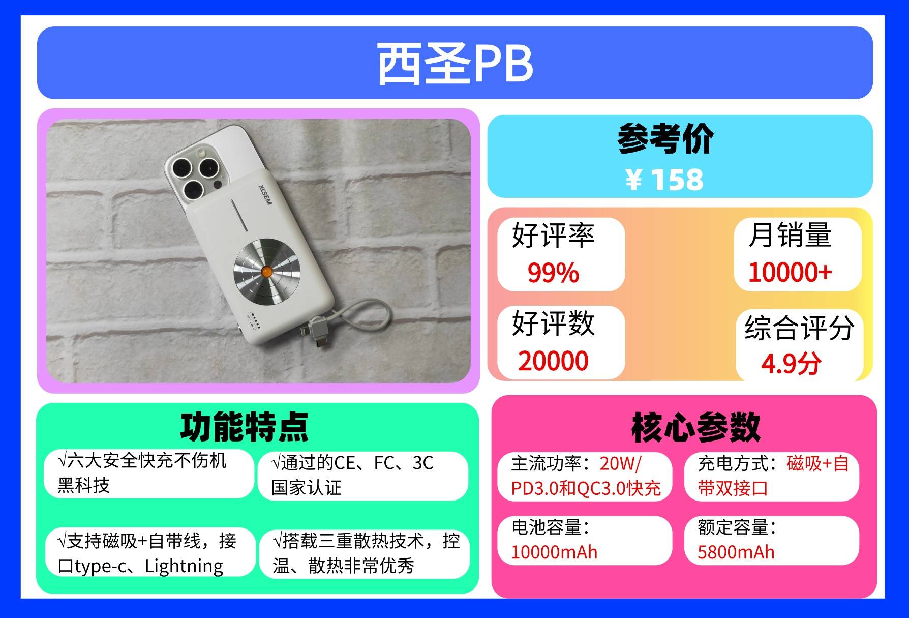 顶级性能,百元价位首选:在平价充电宝里,这款充电宝几乎无敌!在充电效率、控温技术、安全性能全面超越同价位产品媲美千元机型,如果只买一款高性价比充电宝,西圣PB必选!