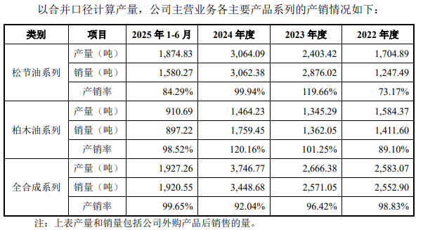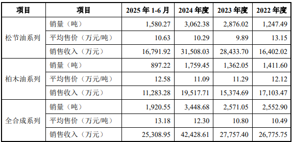 报告期内,格林生物的松节油系列产品销量分别为1704.89吨、2403.42吨、3064.09吨和1874.83吨,突厥酮系列产品销量分别为476.71吨、516.26吨、1035.24吨和656.16吨;产能利用率分别为76.15%、67.51%、73.79%和53.87%。