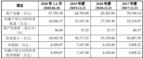 彼时招股书显示,2017年至2019年及2020年上半年,公司营收分别是4.21亿、5.15亿、5.67亿、2.95亿元,归母净利润分别是3058.22万、4182.06万、7167.8万、4394.07万元;主营业务毛利率分别为25.06%、23.59%、28.43%和29.87%。