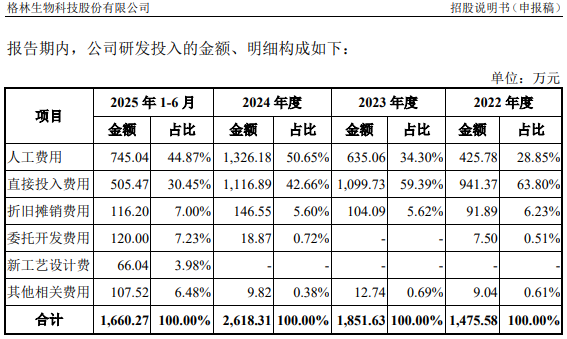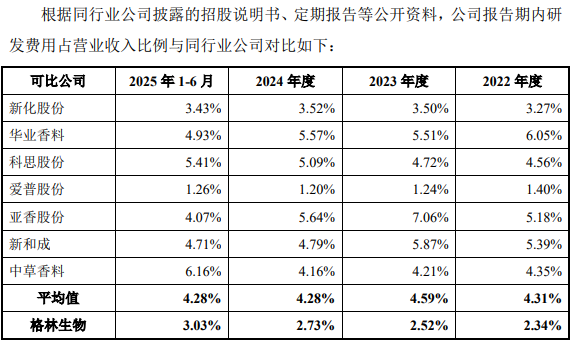 结合此前招股书,2017年至2024年及2025年上半年,格林生物研发投入分别为1591.77万、1712.11万、2252.09万、1817.47万、2043.76万、1475.58万、1851.63万、2618.31万、1660.27万元,占当期营收的比例为3.78%、3.32%、3.97%、3.37%、3.44%、2.34%、2.52%、2.73%、3.03%。