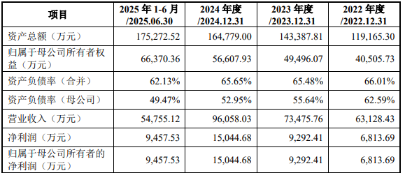 2022年至2024年及2025年上半年,公司营收分别为6.31亿、7.35亿、9.61亿、5.48亿元,归母净利润分别为6813.69万、9292.41万、1.5亿、9457.53万元;主营业务毛利率分别为23.67%、26.22%、29.71%和31.51%。