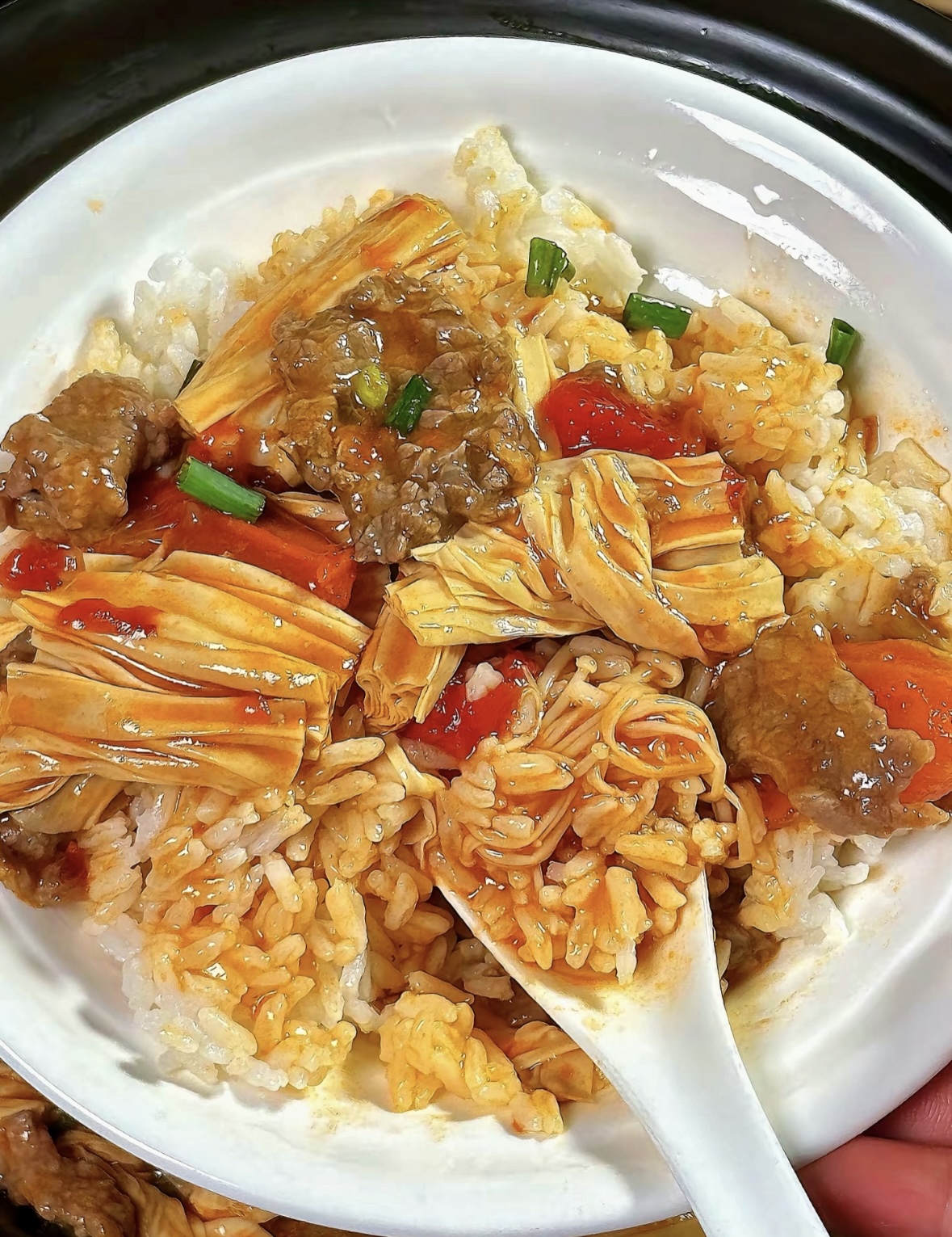 掀盖瞬间,番茄的红、腐竹的黄、牛肉的棕、葱花的绿,像打翻的调色盘。先别急着动筷子,拿勺子舀一勺汤汁浇在米饭上,米粒立刻裹上酸甜外套,闪着油光;牛肉嫩到能弹舌头,轻轻一咬,肉香混着番茄的清爽,像夏天傍晚的凉风;腐竹最狡猾,外表软萌,内里却藏着爆浆汤汁,一咬“呲啦”一声,烫得直跳脚也舍不得吐。五分钟前还在喊减肥的室友,默默把第三碗饭递过来:“再来点汁,别浪费。”