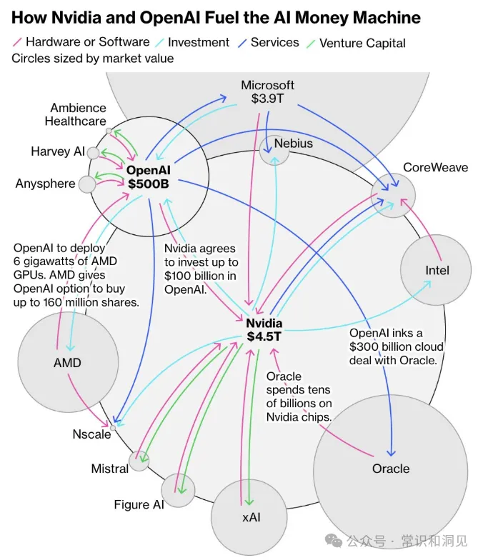 在这些协议之下,OpenAl、英伟达、AMD、甲骨文、微软、CoreWeave等巨头通过股权、债务及长期算力购买合约,形成了庞大的绑定网络。资金在这个网络中的芯片、云、数据中心及能源企业之间循环流转。
