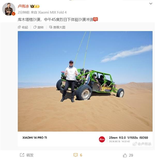 快科技8月18日消息,近期,小米SU7开启新一轮吐鲁番夏测。今日,雷军、卢伟冰等高管现身库木塔格沙漠,体验全地形车沙漠冲浪。