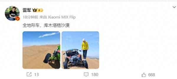 早先,雷军发微博称,去年吐鲁番夏测,我们在库木塔格沙漠公路上路测。到了龙门客栈越野基地,随便体验了一下全地形车ATV,特别刺激,有冲浪的感觉。今年夏测又到了这里,打算试试沙上漂移。