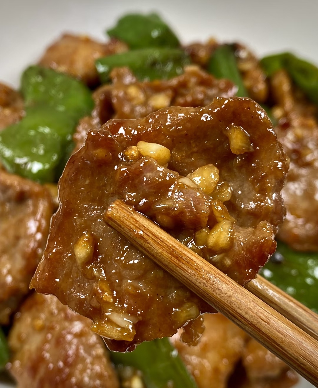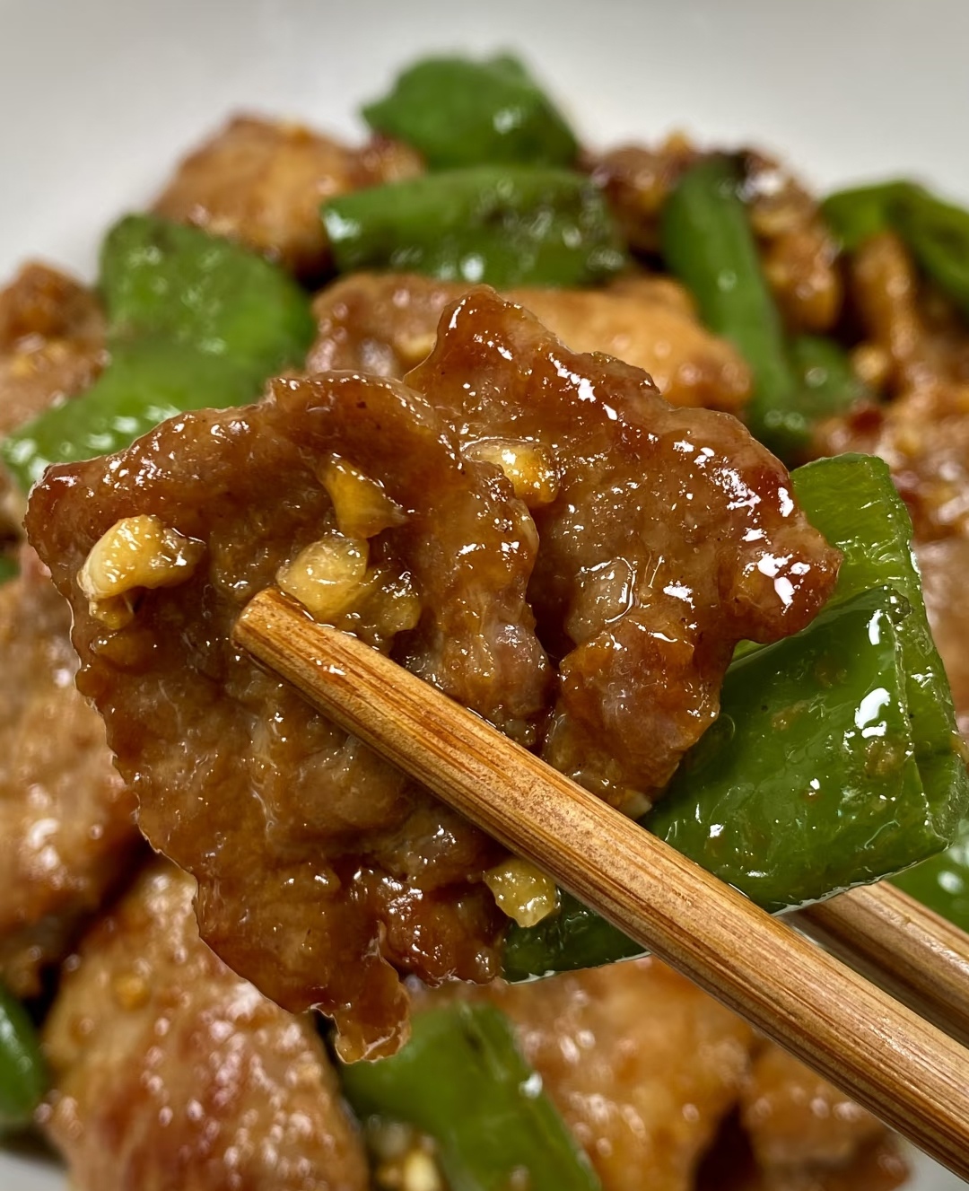 大火把锅烧到冒青烟,倒 1 圈油,蒜片扔进去“噼里啪啦”秒变金色。里脊下锅,30 秒变色立刻盛出,留底油炒青椒,锅铲压一压,让青椒表皮起虎皮。再把里脊回锅,蚝油沿锅边淋一圈,“呲啦”一声白雾升腾,厨房瞬间变身深夜小馆。