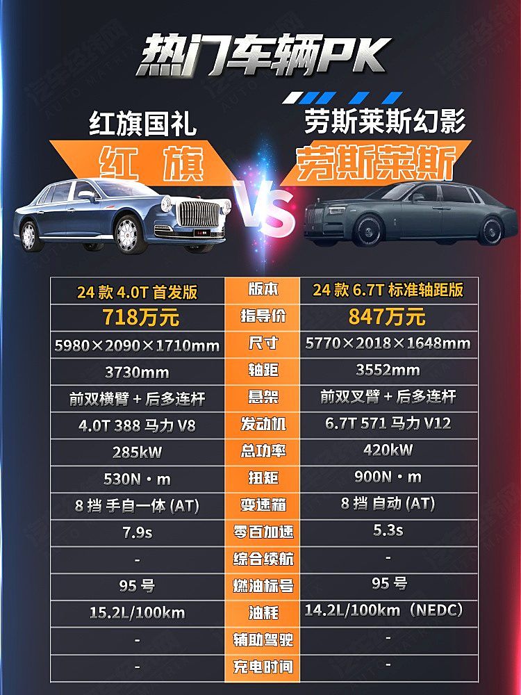 我们将以2024款劳斯莱斯幻影6.7T标准轴距版(847万) 红旗国礼2024款4.0T V8标准版(718万)为例,看看谁更符合你心目中“有钱人玩具”的定位。