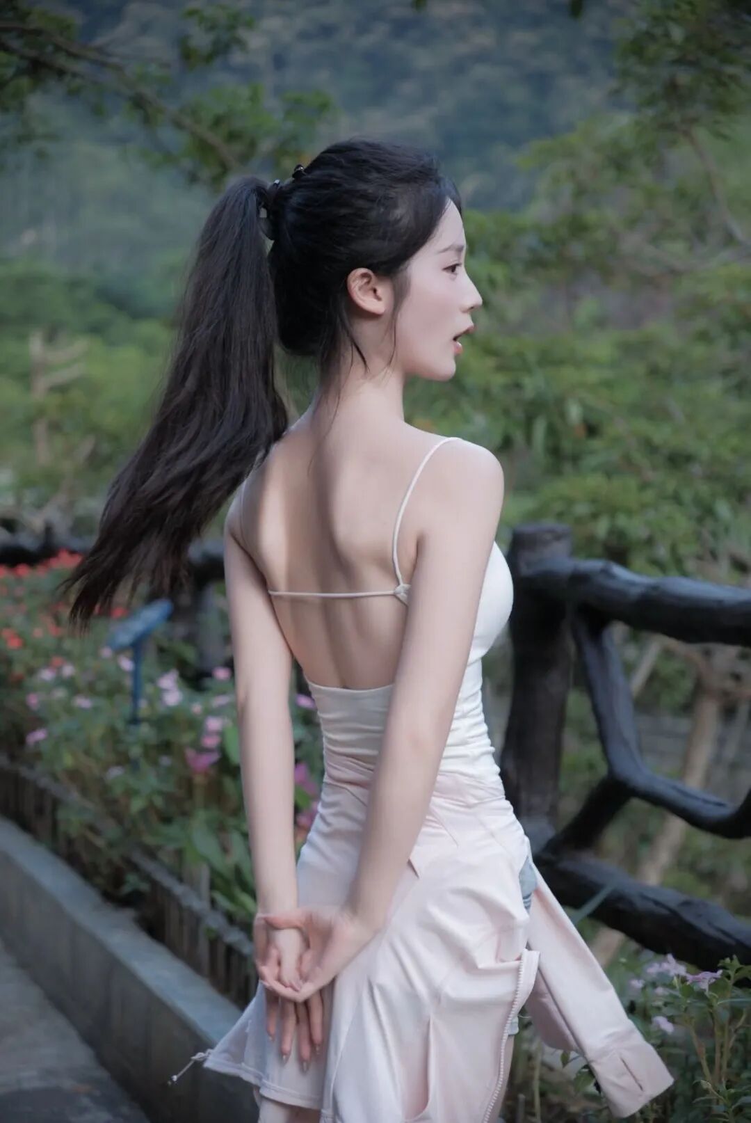 将双手交叠放在身前,身体保持端正,尽显优雅端庄的气质。这个姿势比较简约大方,适合想要展现文静、温婉一面的拍摄。它能让画面呈现出一种静谧的美感,突出人物的优雅仪态,在户外自然景色的衬托下,更显清新脱俗。